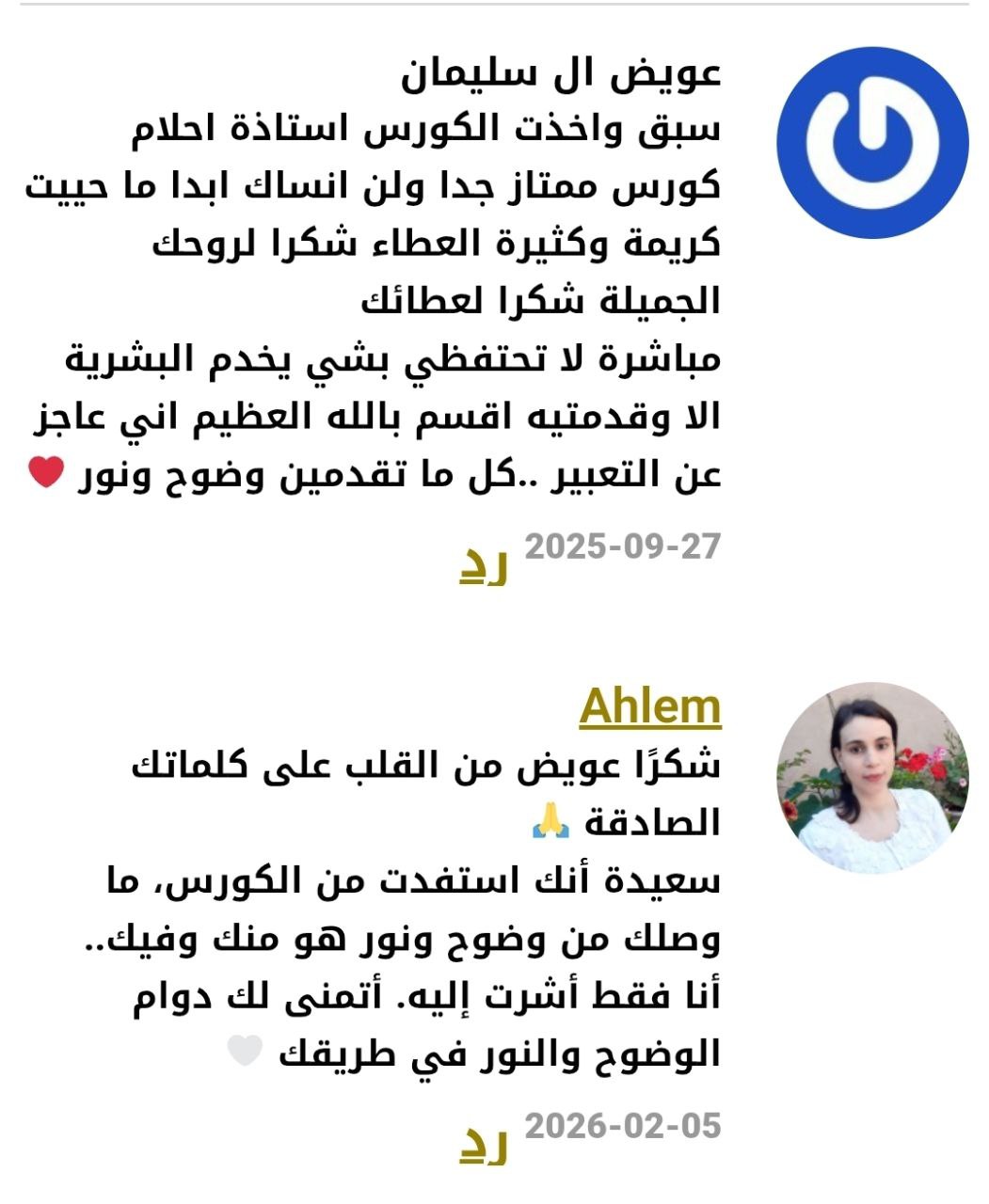 واليوم، تتشرّف بفتح لك باب هذا الوضوح ومشاركتك ثمرة هذه الرحلة، لمرافقتك في استعادة اتصالك بنورك وسط العتمة، وتذكيرك بقوتك الحقيقية، عبر منهج متكامل مستوحى من تجربتها المباشرة، يختصر عليك الكثير من التيه والبحث الدائري، ويضع بين يديك خلاصة هذا المسار.